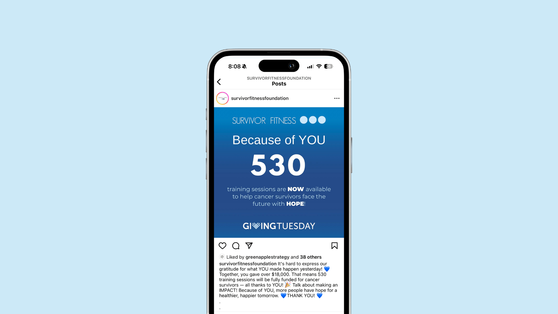 Survivor Fitness has been participating in GivingTuesday since 2019 and recently connected with Green Apple Strategy to help design a campaign theme and social media strategy for GivingTuesday.